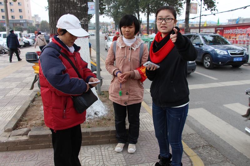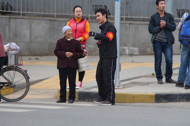 活动中,志愿者们在接受了交警简单的岗前培训后,就带上印有“交通协管员”字样的袖章按分工走上各自的工作岗位,在西农路与康乐路十字路口东西南北每一个方向都有至少两名志愿者担任文明交通协管员,在进行文明交通劝导的同时呼吁广大市民积极响应“安全出行,方便你我”的号召。对于每一个试图闯红灯或者其他违反交通规则的行为,志愿者们均会及时上前进行善意的提醒和劝导,绝大多数市民对于志愿者们的工作也都给予配合,有的还表达出了高度的赞赏和肯定。对于一些年迈的老人,志愿者们主动耐心地帮助其安全过马路,并为其讲解交通安全知识。“请您走人行道”,“现在还是红灯”,“请您等一下好吗?”“可以过马路了,请注意安全”…….这样的声音一遍又一遍地回荡在西农路与康乐路十字路口,为行走在路上的人们带来了安全的提醒和便利的帮助。