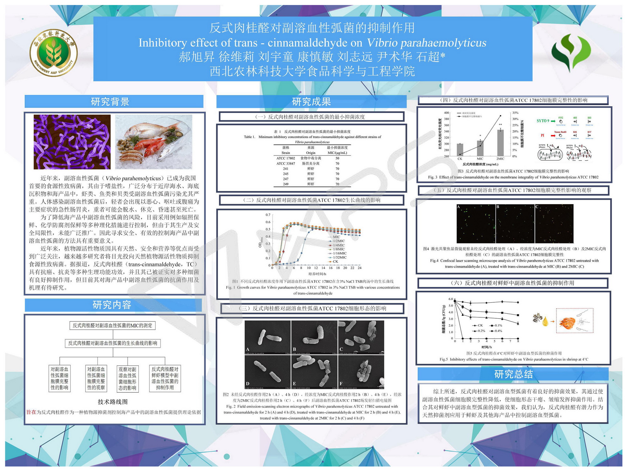 2 | 反式肉桂醛对副溶血性弧菌的抑制作用 | 食品学院 | 郝旭昇 | 徐维莉 刘宇童 康慎敏 刘志远 尹术华 |