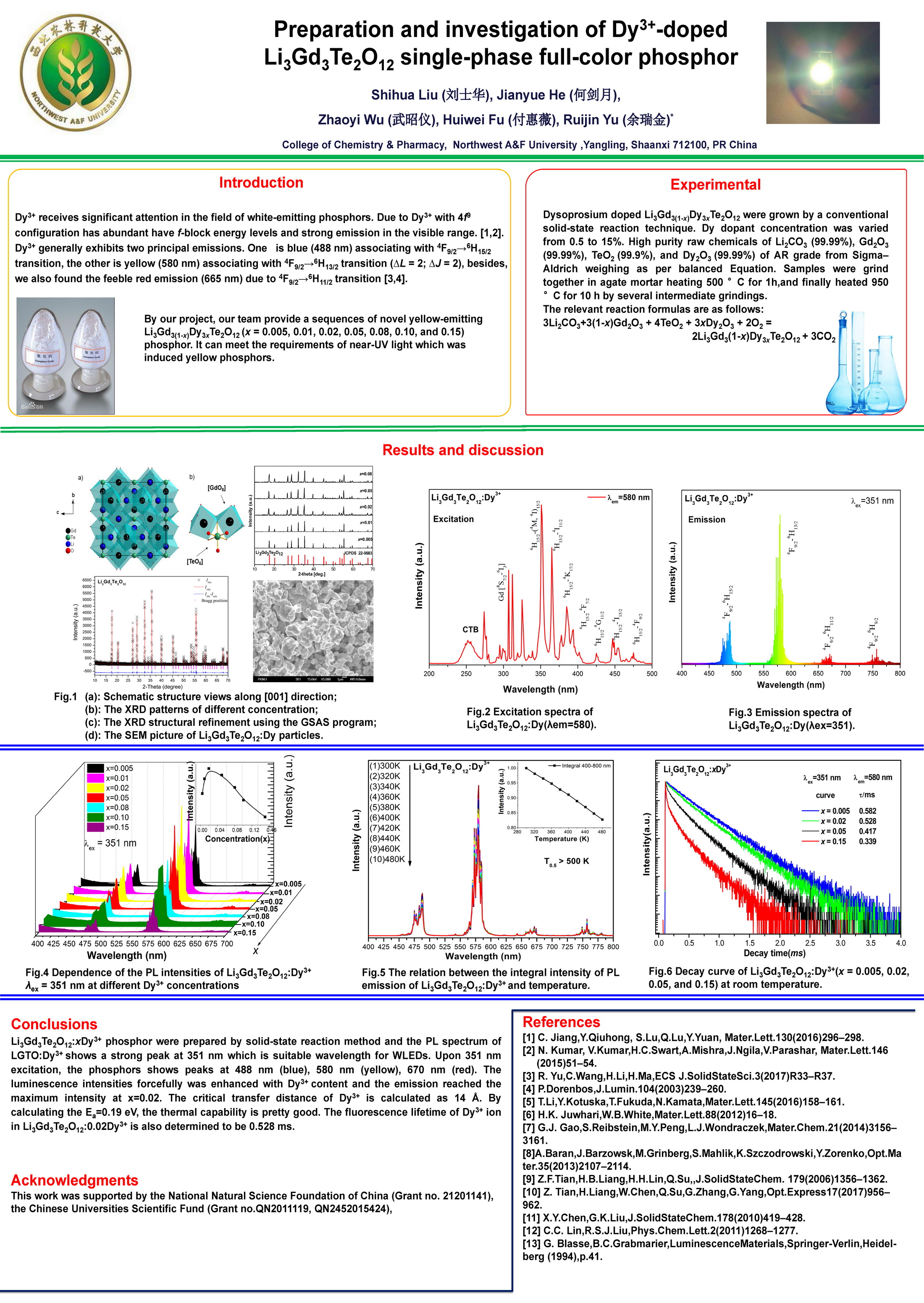 4 | Preparation and investigation of Dy3+-doped Li3Gd3Te2O12 single-phase full-color phosphor | 化药学院 | 刘士华 | 何剑月 武昭仪 付惠薇 |