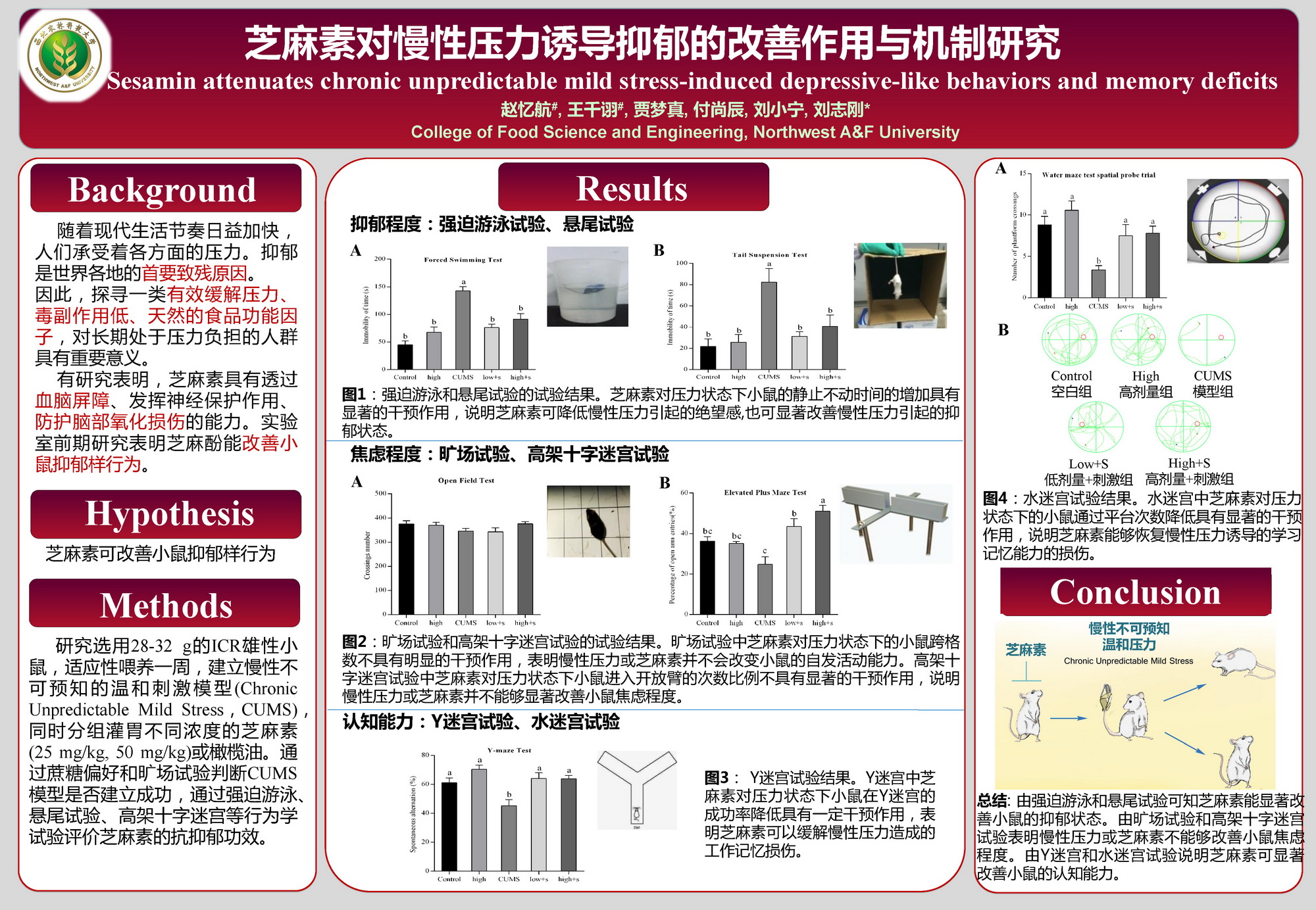 1 | 芝麻素对慢性压力诱导抑郁的改善作用与机制研究 | 食品学院 | 赵忆航 | 王千诩 贾梦真 付尚辰 刘小宁 |
