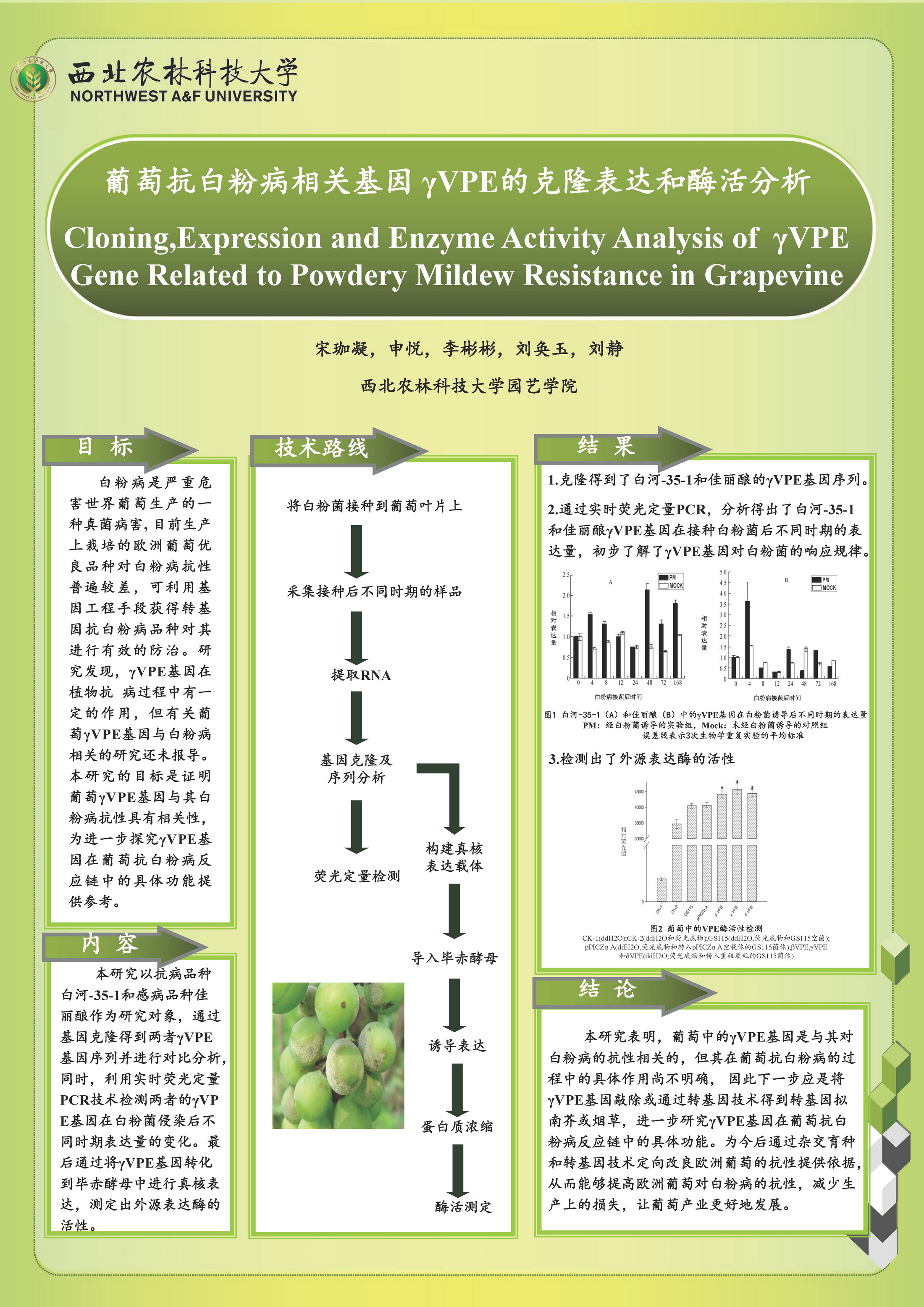 14 | 葡萄抗白粉病相关基因γVPE的克隆表达和酶活分析 | 园艺学院 | 宋珈凝 | 申 悦 李彬彬 刘奂玉 刘 静 |