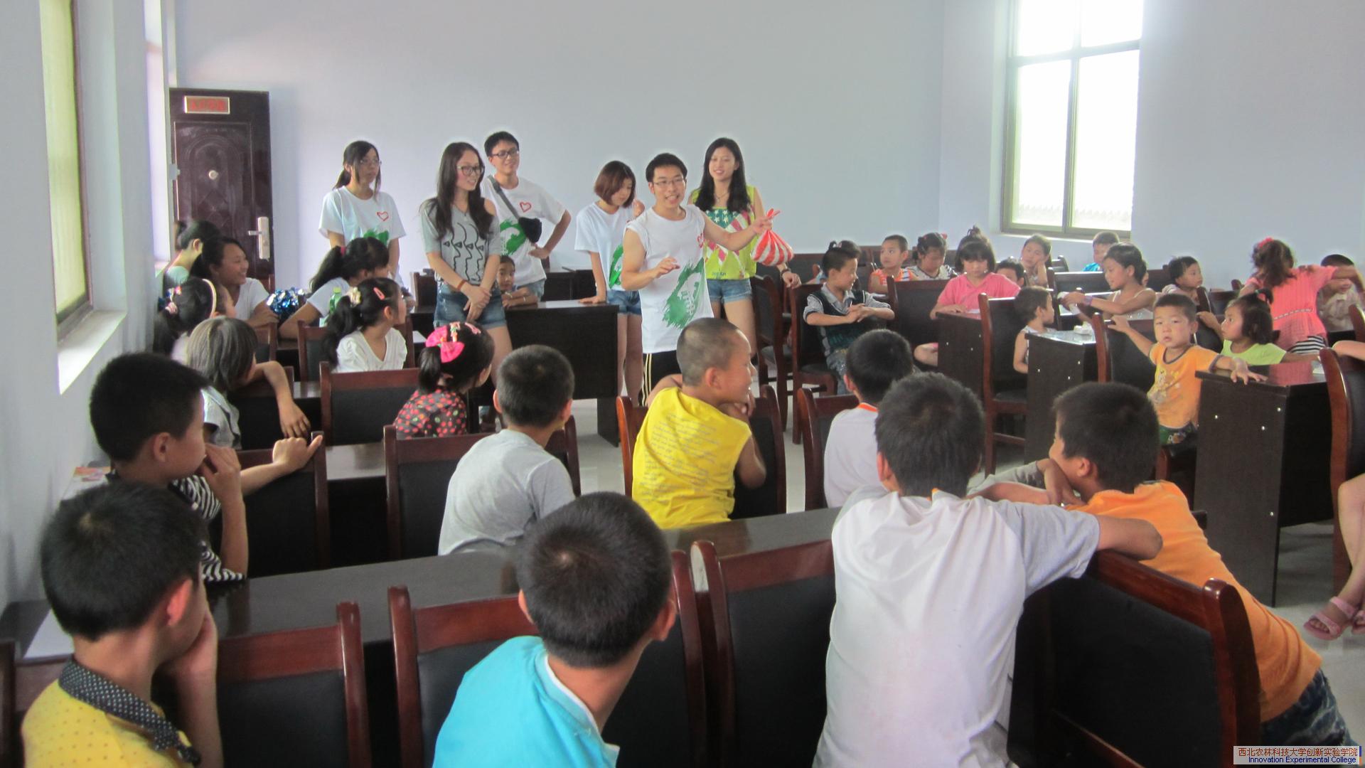 7月16日起,服务队的支农-支教活动正式展开。每天上午,服务队在西寨村村委会开展双语支教活动。根据孩子们的实际情况和爱好,从学龄前到初中的50余名学生分别被编入英语初级组、英语高级组和课业辅导组,同时开设了专门的兴趣爱好培训课,包括舞蹈、绘画、棋类等,使孩子们在学习之余,也体验了精彩纷呈的课间娱乐项目。这边,“来是come 去是 go, 点头yes 摇头no”,英语初级组的孩子们背诵着一些简单的问候语、称呼等;英语高级组的孩子们开始了语法、发音的训练;课业辅导组的孩子们围成一圈争着请负责队员检查作业、答疑解惑;那边,美术课孩子们兴致勃勃的画房屋、画企鹅;舞蹈组的孩子们在队员的带领下也在走廊上跳得不亦乐乎。村委会,瞬间成了孩子们的天堂。