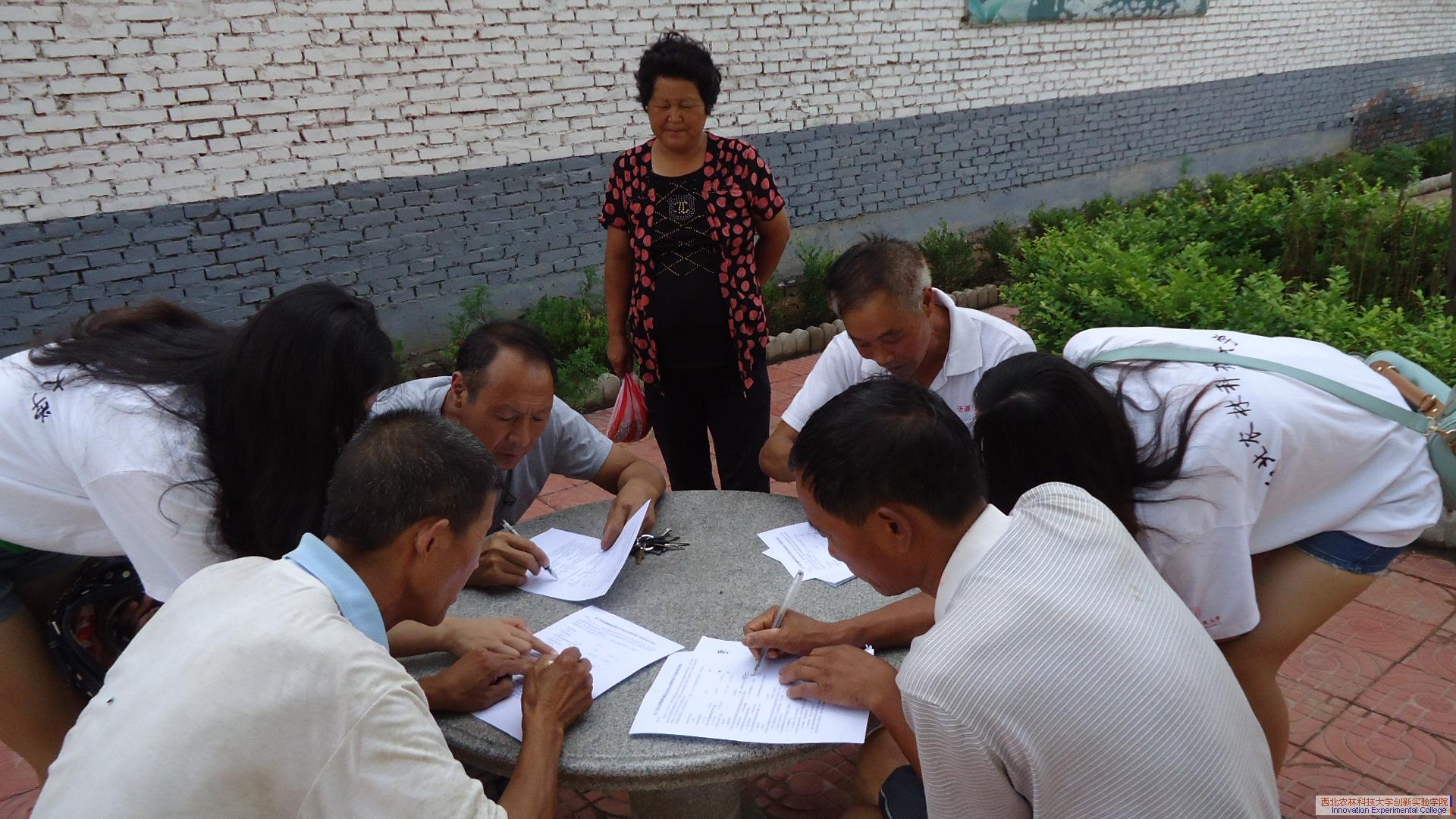 到达试验站的当天,队员们不顾疲劳,分头走访了西寨村、石马寺村、安沟村等村庄,发放了调查问卷和宣传资料,初步了解了基地周围村庄居民的生产生活情况,收集了村民们所关心的猕猴桃和其他果蔬种植方面问题,同时向村民们宣传服务队的双语支教活动,得到了村民们的大力支持和积极响应。每到一个村庄,服务队都积极联系村委会负责人,掌握村里的整体情况,协商安排支农-支教活动的具体实施细节,力争使每一项活动都落到实处。