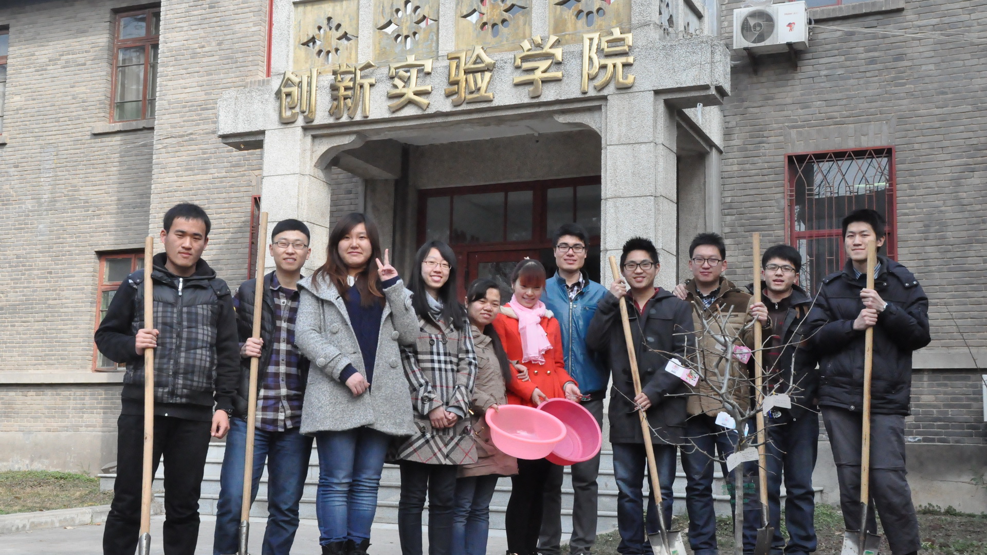 植树现场, 我院院长陈遇春、书记孙玉瑷等院领导与毕业生代表们一起挥掀铲土,浇水灌溉,为学校栽植新绿,现场呈现出一片热火朝天的劳动景象。不一会儿功夫两颗海棠树已在大家的共同努力下稳稳站在学院楼前,毕业生们为海棠树挂上了印有“创新实验学院2014届毕业生纪念树”的标志牌,埋下了许愿瓶,将写有自己梦想和祝福语的心愿卡挂在树枝上,表达了心中的感恩和眷恋,祝贺学校80华诞,祝福全体毕业生带着梦想扬帆起航。