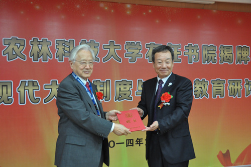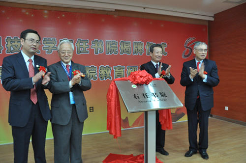 常务副校长赵忠宣布右任书院成立并向于右任孙子于子桥教授颁发院长聘书。右任书院首任院长于子桥、香港中文大学原校长刘遵义、我校常务副校长赵忠、党委副书记马建华为书院揭牌。