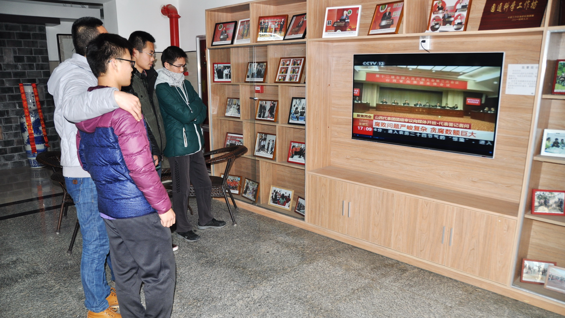 学生在“瑾瑜轩”大厅观看两会实况